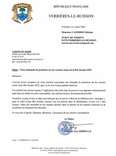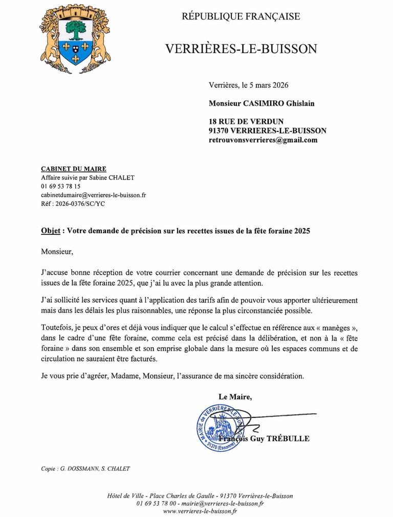 Comme convenu, je porte à votre connaissance la réponse de Monsieur le Maire suite à mon courrier relatif aux tarifs d'occupation du domaine public par la fête foraine.